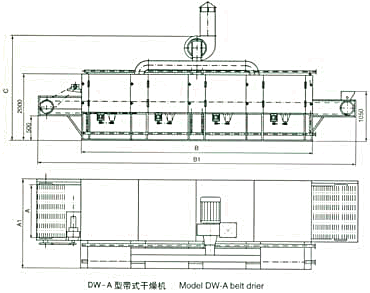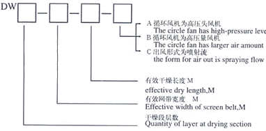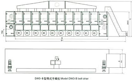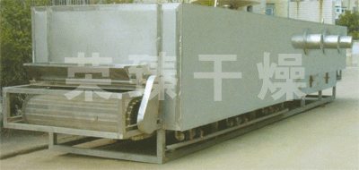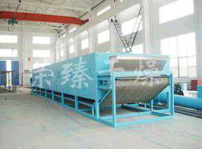 将需要处理的物料通过适当的布料机构,如星型布料机、摆动带、粉碎机或造粒机,分布在输送带上,输送带通过一个或几个加热单元组成的通道,每个加热单元均配有空气加热和循环系统,每一个通道有一个或几个排湿系统,在输送带通过时,热空气从上往下或从下往上通过输送带上的物料,从而使物料能均匀干燥。
