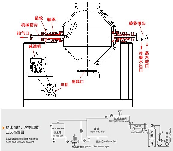 SZG双锥真空干燥机是我厂在结合国内同类产品技术所开发新一代干燥装置,是集混合、干燥于一体的新型干燥机,是将冷凝器、真空泵与干燥机配套,组成真空干燥装置。(如不需要回收溶媒,可不用冷凝器。)